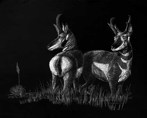 Original Scratchboard drawing of pronghorn antelope.The original is no longer available, but high quality prints available in many sizes. prints are either giclee or