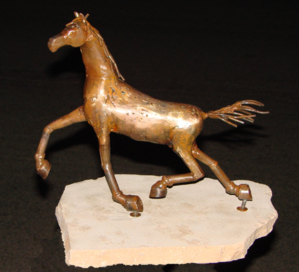 Trotting steel horse sculpture on sandstone base. Overall length is 16 inches and height is 13 inches.
