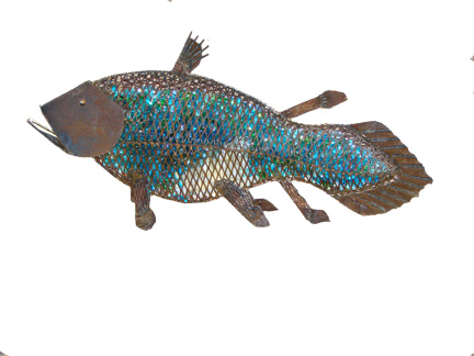 A whimsical tribute to Coelacanth, (a real life living fossil) Sillycanth is filled with glass marbles to make her sparkle in the light.