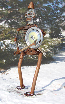 A comical sentry for your yard, Sir Auto is built mainly from discarded automobile parts. He stands about 5 feet tall and weighs around 40 pounds.