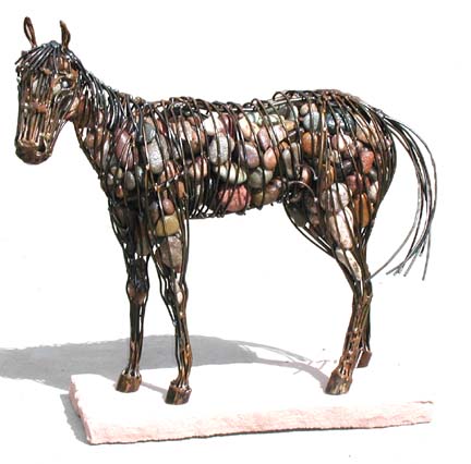 One of a kind horse sculpture created from welded 9 gauge steel wire, filled with natural pebbles. Overall height 24 inches, overall length 27 inches. Mounted on sandstone slab. Weighs approximately 56 pounds. SOLD