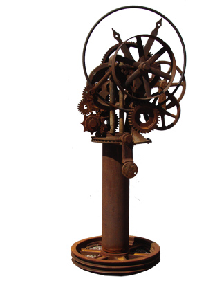 The Timepiece is a collection of antique gears combined with modern industrial gears and other found objects to resemble the workings of a large clock.