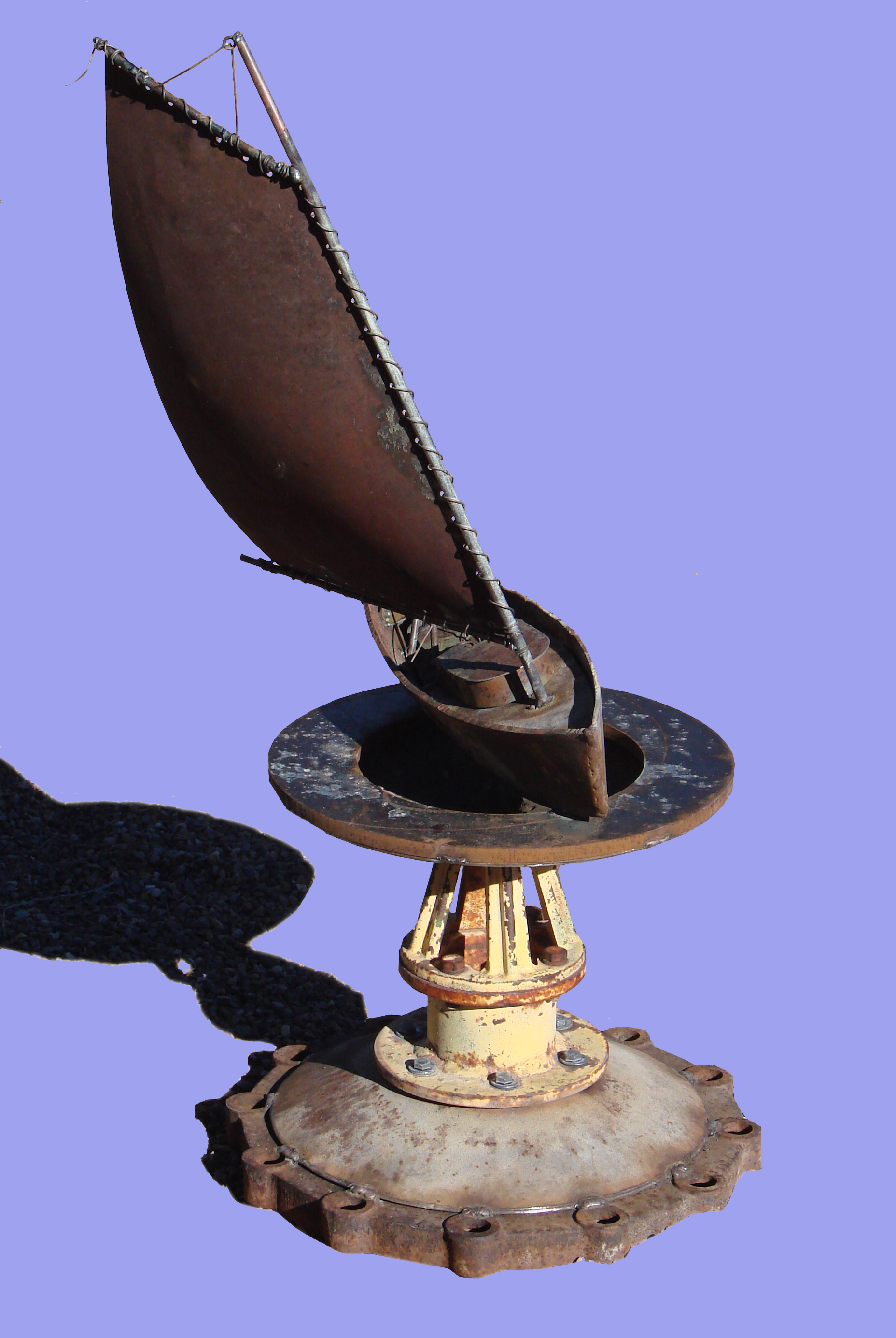 Steel catboat with gaff rigged sail and solo sailor. Hull made from slices of large diameter pipe and sail cut from Model A Ford fender.