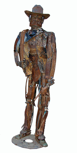 Life size found object cowboy made from discarded farm equipment and automotive leaf springs. Designed to be part of the piece, "Dyin' Breed", but ended up sold separately.